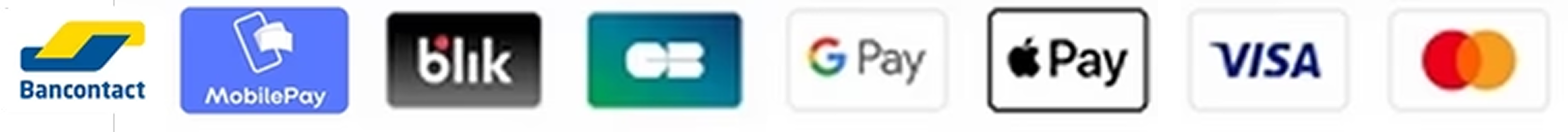 Aceitamos métodos de pagamento seguros como Visa, Mastercard, Maestro, Blik, Apple Pay, Google Pay, MobilePay, Bancontact e Carte Bancaire